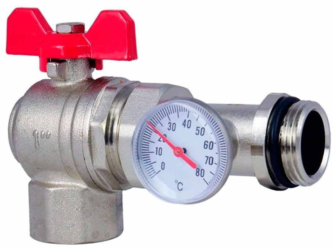Кран с американкой с термометром 1" угловой красный TIM