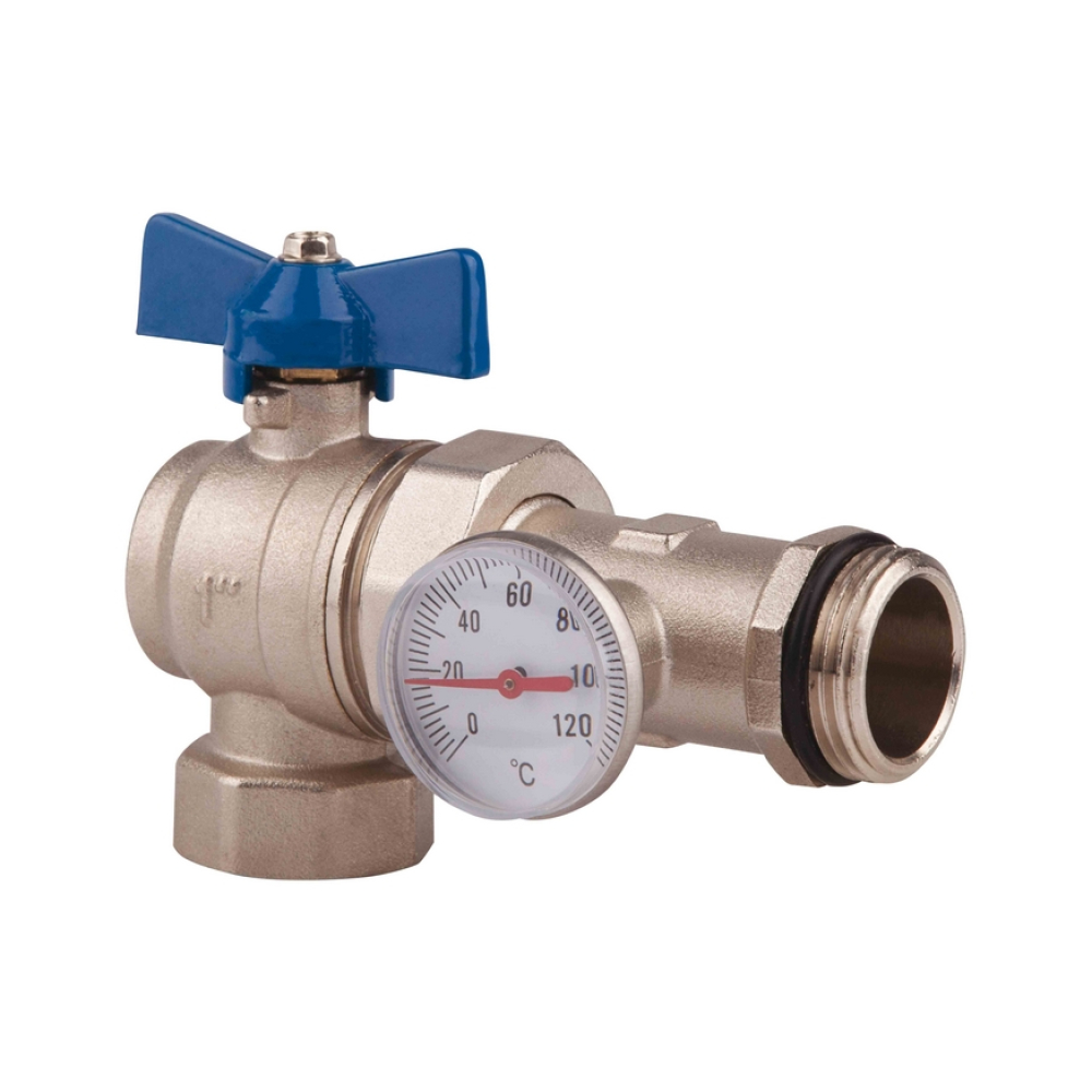 Кран с американкой с термометром 1" угловой синий TIM