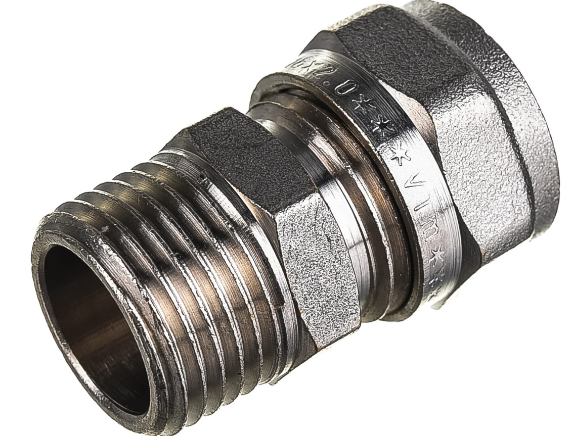 Прямой латунный никелированный фитинг для соединения металлополимерной трубы и компонента системы с резьбовым подключением. Резьба фитинга – наружная трубная по ГОСТу 6357