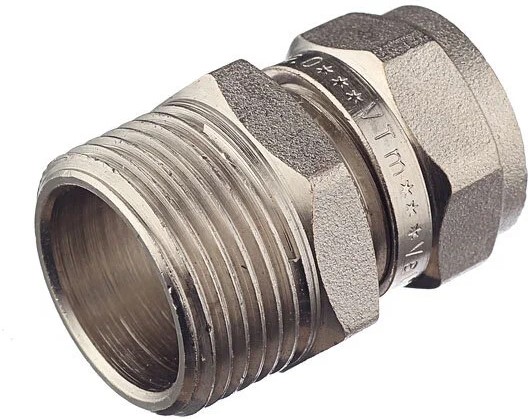 Прямой латунный никелированный фитинг для соединения металлополимерной трубы и компонента системы с резьбовым подключением. Резьба фитинга – наружная трубная по ГОСТу 6357