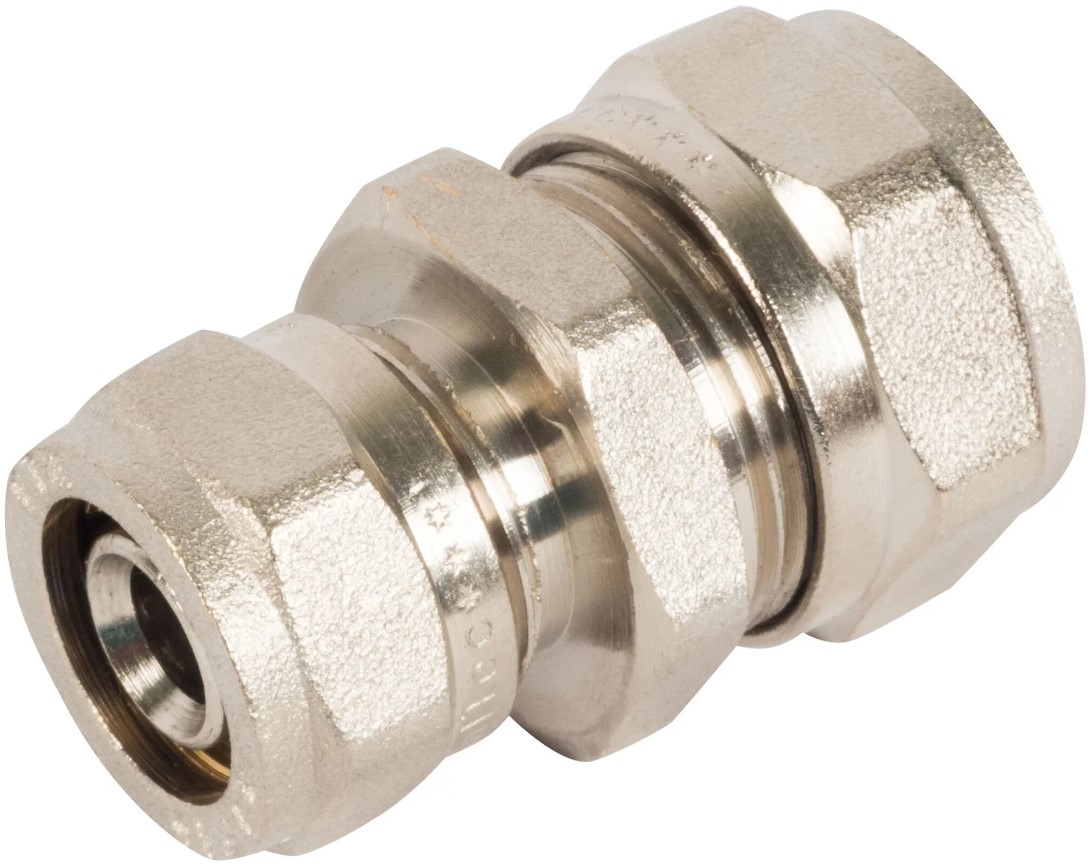 Прямой латунный никелированный фитинг для соединения металлополимерных труб. Имеются равнопроходные модели и модели с переходом на другой диаметр