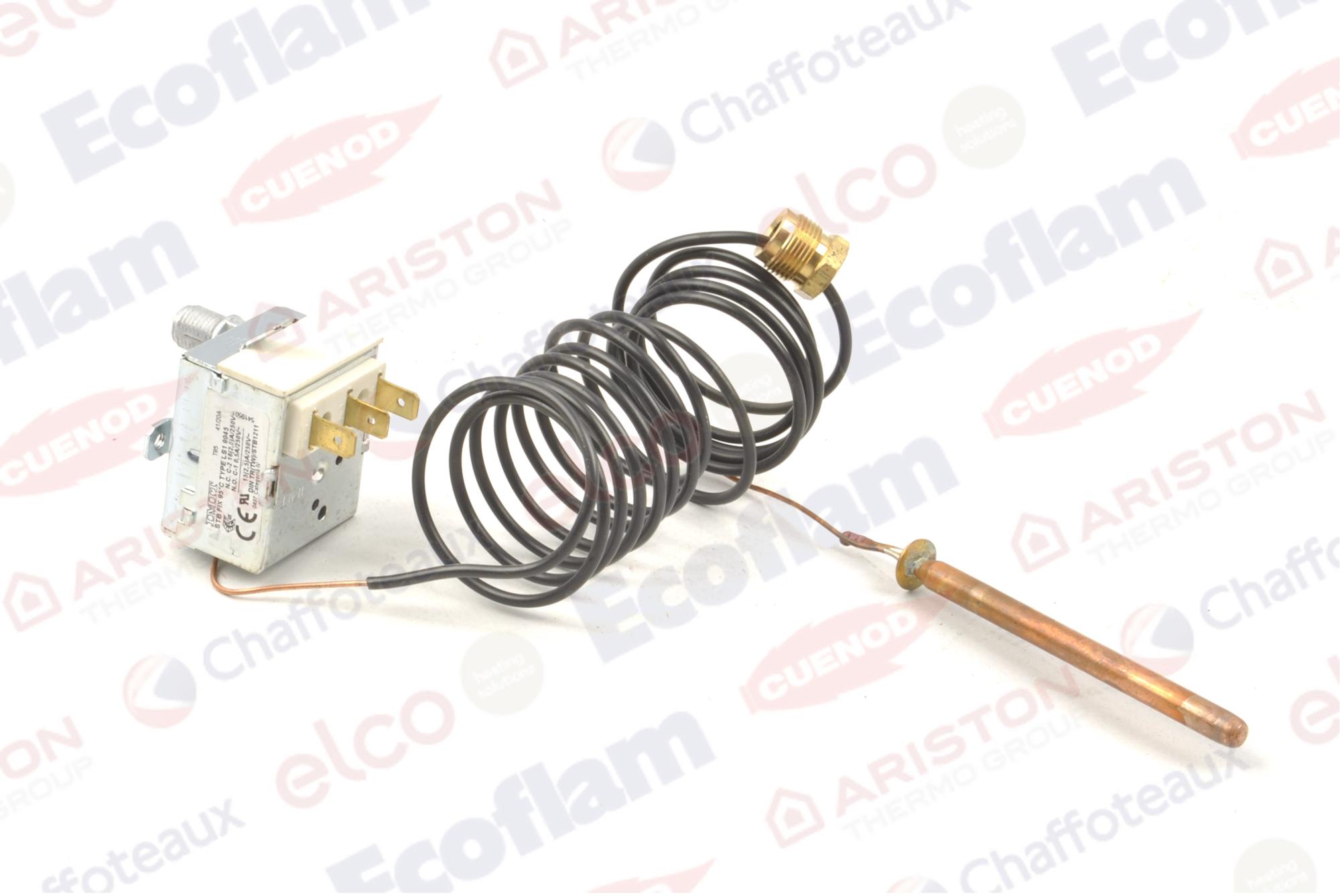 Предназначен для предохранения от закипания оборудования при повышении температуры выше допустимого уровня, замыкая электрическую цепь и контролируя температуру отводящих газов. Устанавливается на дымоходе. Имеет температуру срабатывания 95°C.