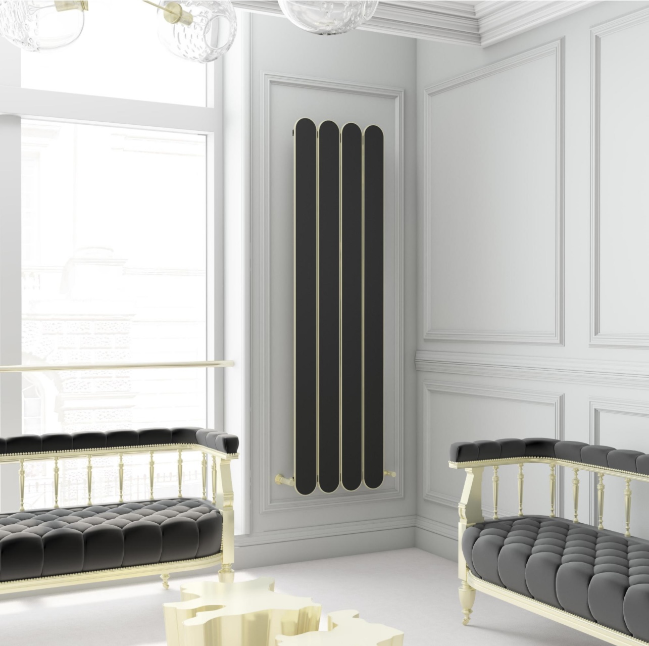 Чеканенные золотые обрамления стали изюминкой этого дизайна. Они зрительно подчеркивают великолепие черной поверхности, принося элемент роскоши и придавая радиатору статус настоящего арт-объекта. Здесь Жан-Пьер подключил свои навыки в работе с металлом, создавая рисунки, которые могут напоминать о традиционных провансальских узорах